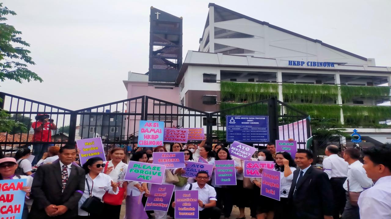 Ratusan jemaat Gereja Huria Kristen Batak Protestan (HKBP) Cibinong gedung lama, melakukan aksi damai di depan...